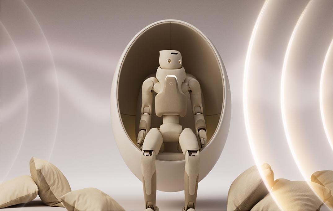 Der Roboter G1 von Galbot wirkt ein wenig zentaurenhaft: Sein Oberkörper ähnelt einem Menschen mit silber-weißem Daft-Punk-Helm, sein Unterkörper ist eine rollende Plattform.